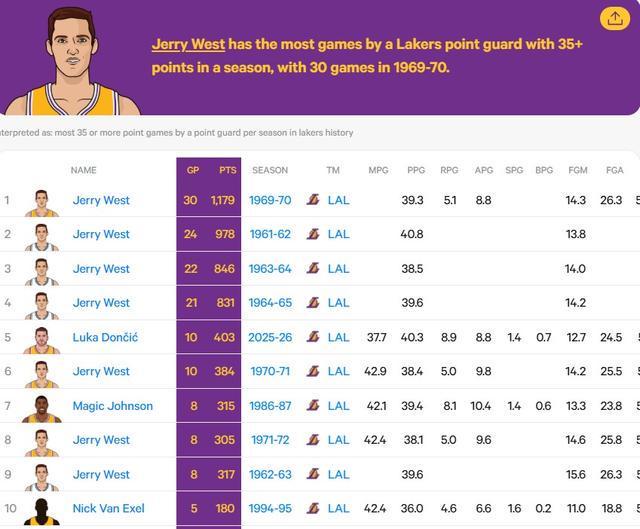 据统计,这是本赛季东契奇第10次砍下单场35+得分,成为湖人队史第二位达成该成就的控卫球员,仅次于传奇球星杰里-韦斯特。上一次湖人控卫单赛季拿到10次及以上场次的单赛季35+得分还要追溯到1970-71赛季,同样是杰里-韦斯特做到的。在这份榜单中,除了东契奇之外,前五名均为杰里-韦斯特所保持,他最多一次单赛季曾拿到过30次单场35+得分。
