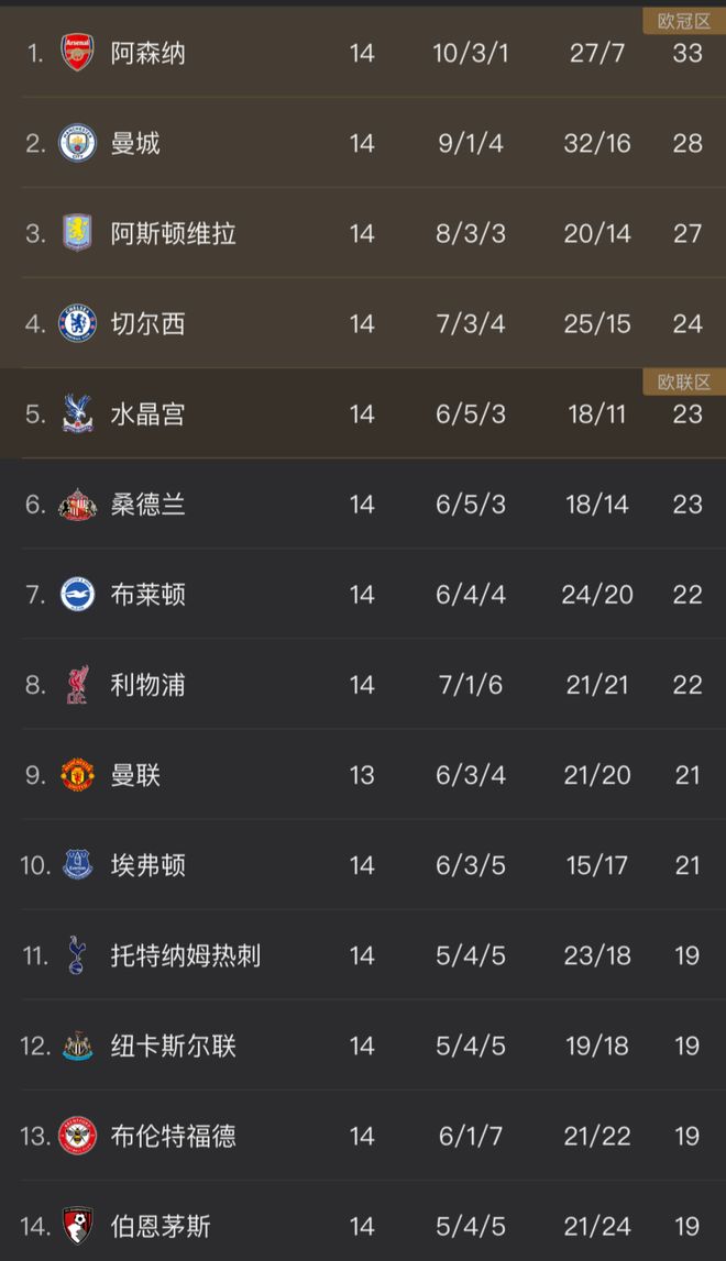在上轮伦敦德比憾平切尔西后,本轮回到主场的枪手凭借梅里诺和萨卡在开场和补时阶段的进球,2-0击败实力不俗的布伦特福德,联赛11轮不败,各项赛事则是18场不败。14轮过后,阿森纳积33分,积分榜以5分优势领跑。